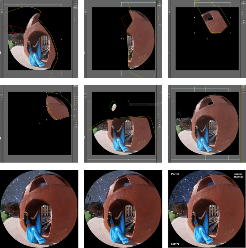 1-6: Bildteile einzeln maskiert. Die Maske liegt nicht exakt an, weil schon das Fulldome Plugin angewendet wurde.